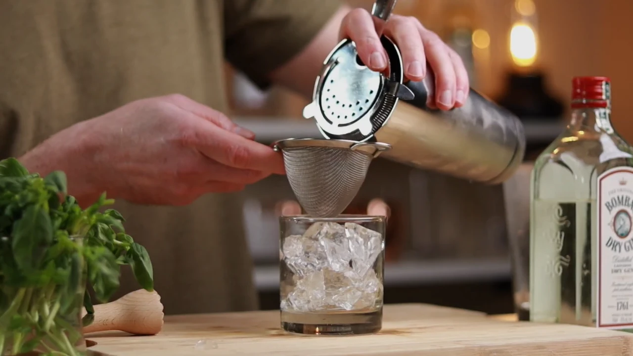 Double strain the cocktail into the glass to remove basil bits and keep the drink smooth.
