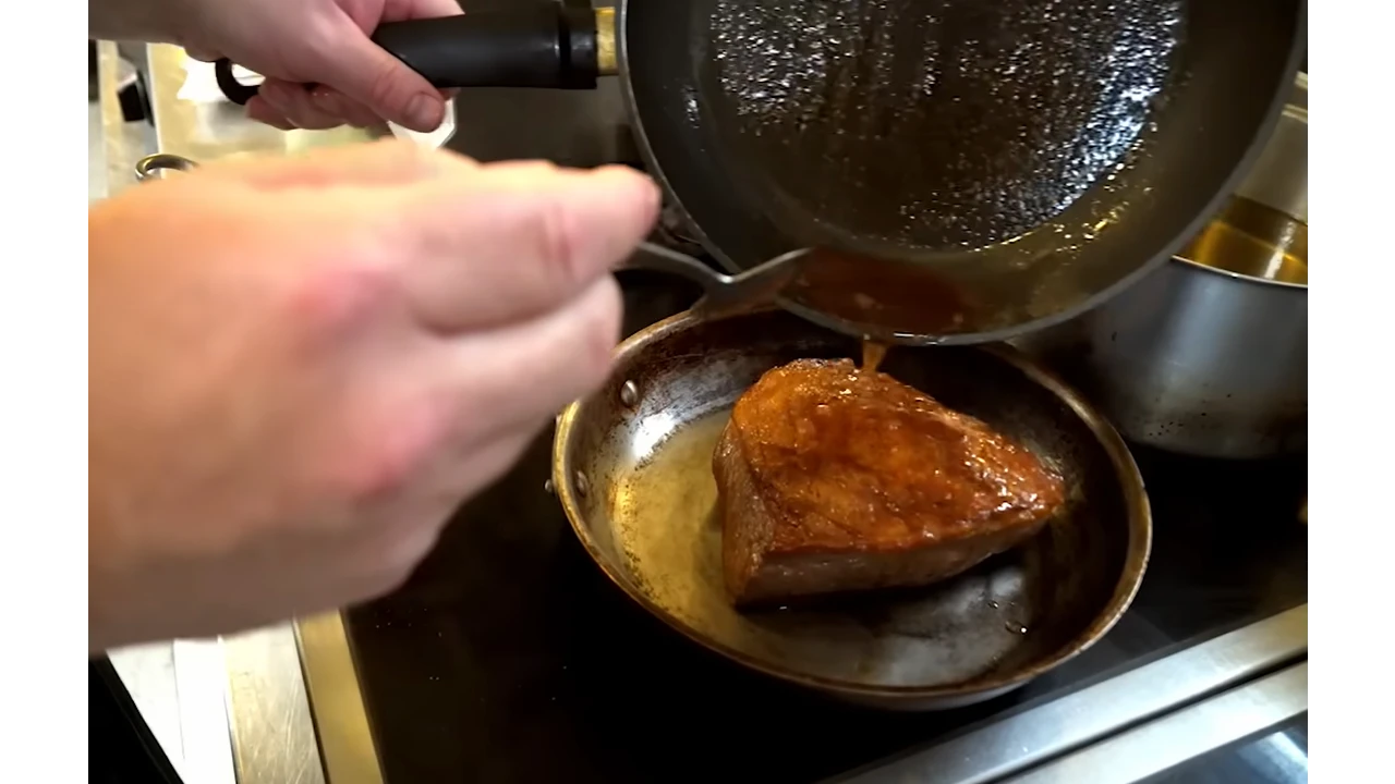 Spoon the hot fat from the pan over the meat to heat it evenly and keep it juicy.