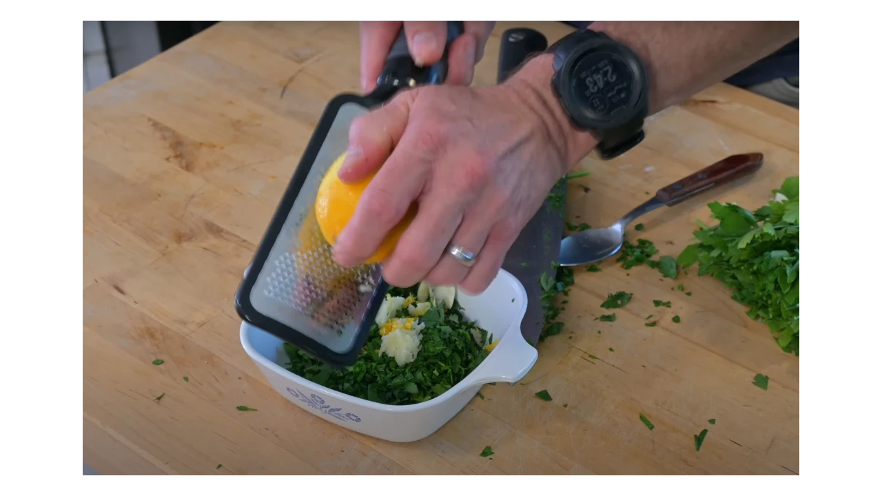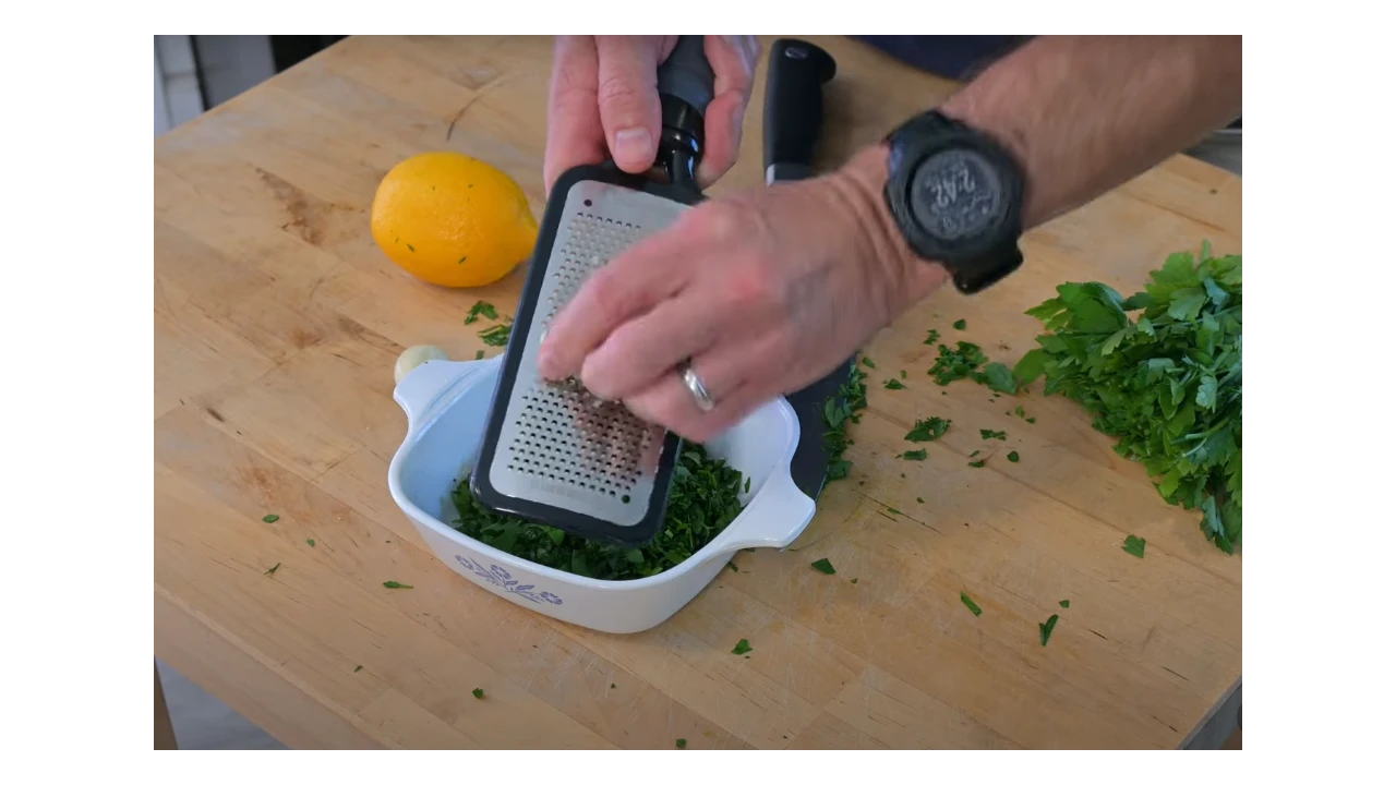 Use one or two garlic cloves depending on your taste. Finely grate or mince them, then add them to the chopped parsley. Garlic adds a strong and rich aroma that’s key to gremolata.