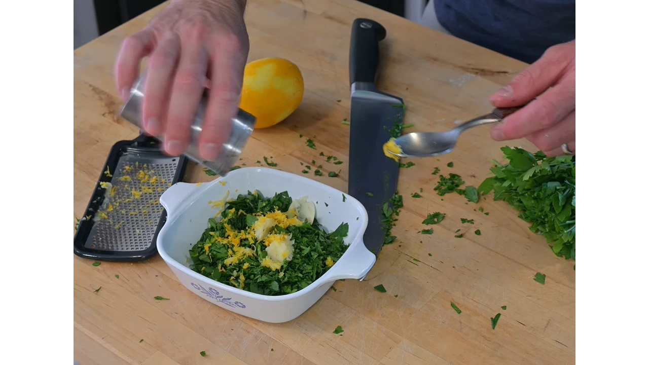 Combine the chopped parsley, garlic, lemon zest, and salt in a bowl. Mix gently until all ingredients are evenly blended.