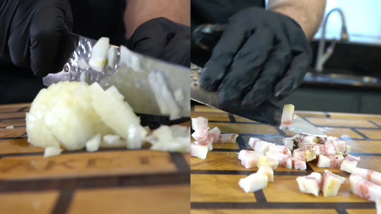 Start by dicing your onion and cutting guanciale or pancetta into small bite-sized cubes. Grate the pecorino romano cheese and chop the parsley. Separate your egg yolks and whole eggs into a mixing bowl.