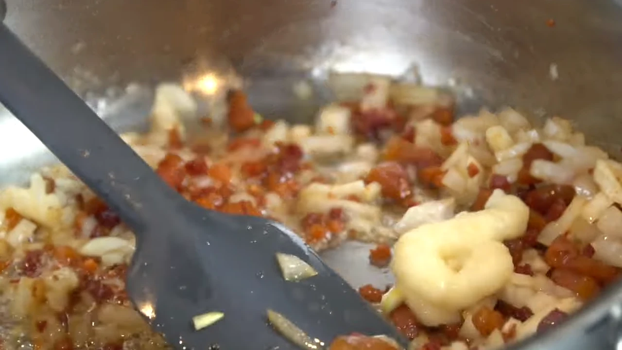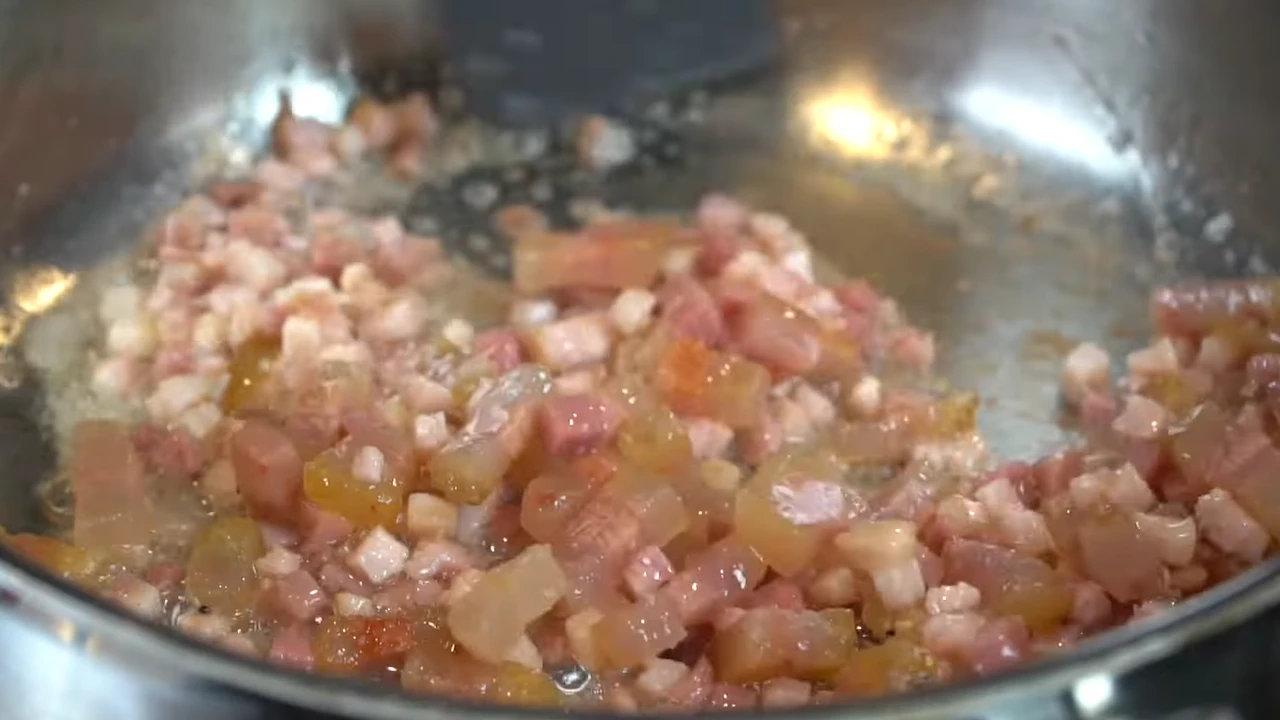 Add the diced onion to the same pan with the rendered fat and cook for 2–3 minutes until soft and fragrant. Add garlic (optional) and stir lightly.