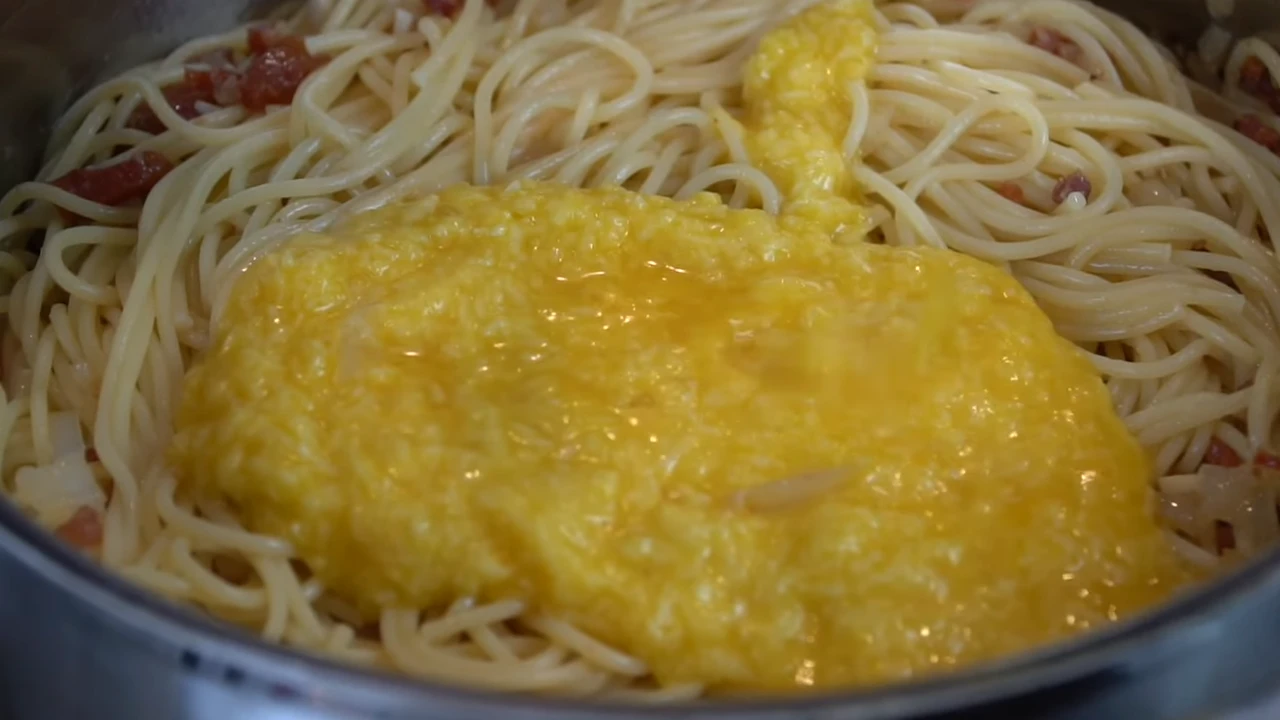 Turn off the heat and pour in the egg-cheese mixture while stirring constantly. The residual heat will thicken the sauce without scrambling the eggs. Add small amounts of reserved pasta water as needed for a smooth, glossy texture.