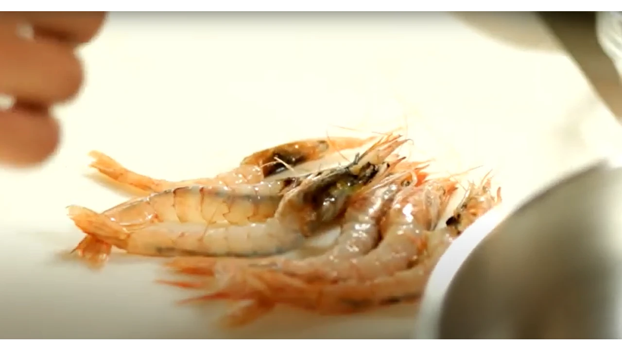 1. Quickly blanch 5–6 whole shrimp in the hot stock for garnish.