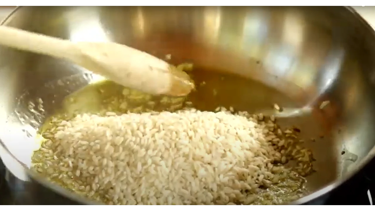 2. Add rice and toast it for 2–3 minutes until slightly translucent.